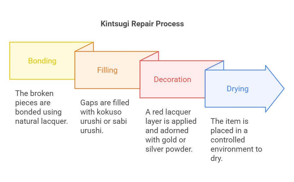 Kintsugi involves several meticulous steps to achieve its beautiful results: