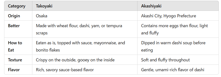 As mentioned at the beginning, While similar to takoyaki, there is a distinctly different dish called Akashiyaki. Akashiyaki is a traditional dish originating from Akashi City in Hyogo Prefecture and is also known as “tamago-yaki” (egg pancake). It is characterized by its fluffy, soft texture, with a batter that contains more eggs than flour, giving it a delicate flavor enhanced by dashi (Japanese soup stock).